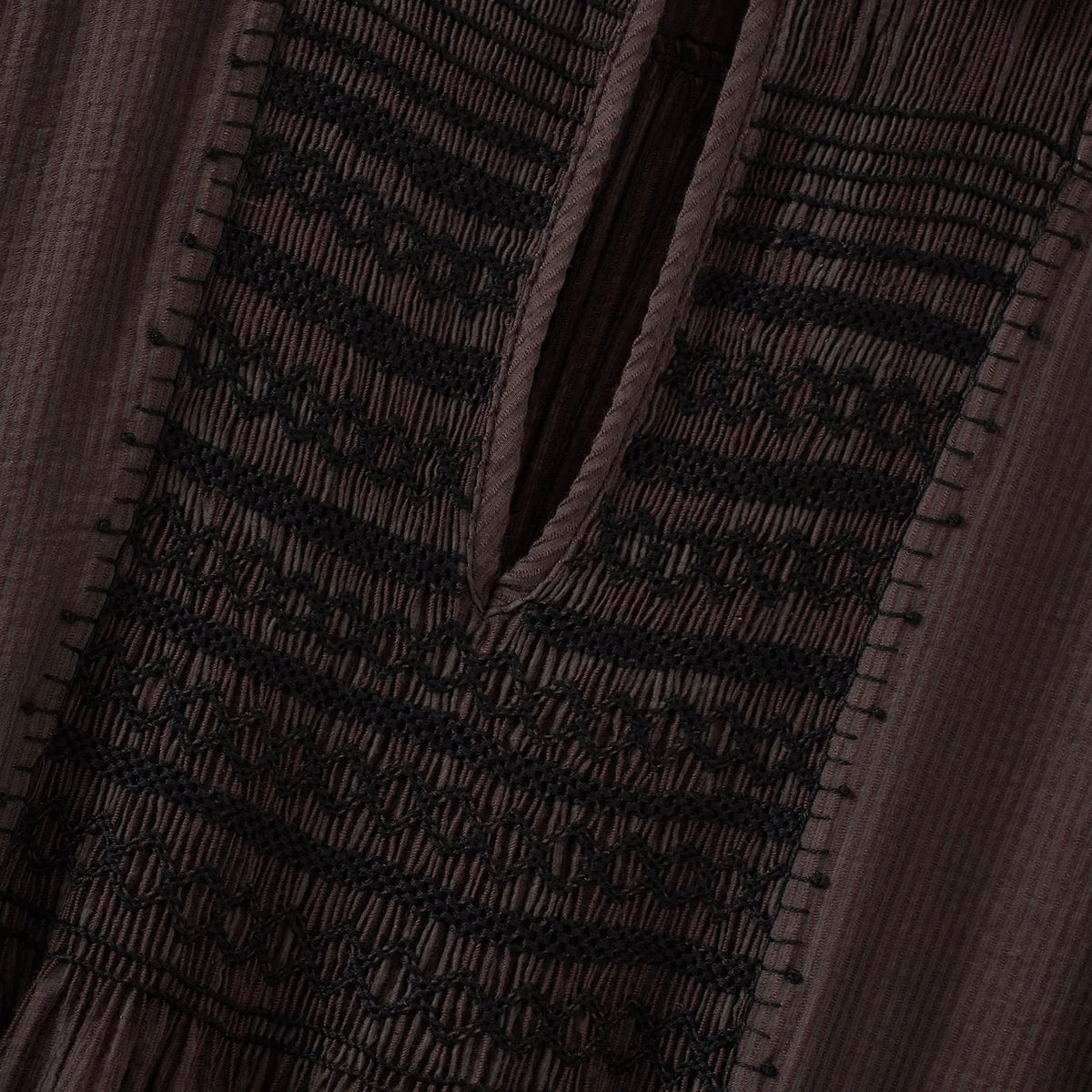 The Mars Dress features a relaxed silhouette. Its rich chocolate hue, gently structured collar, shortened sleeves and discreet front pockets lend a modern edge, while hand-smocking and embroidery, crafted in Madagascar using centuries-old techniques, add an artisanal touch. The dress falls fluidly, light and airy, ideal for warmer days.